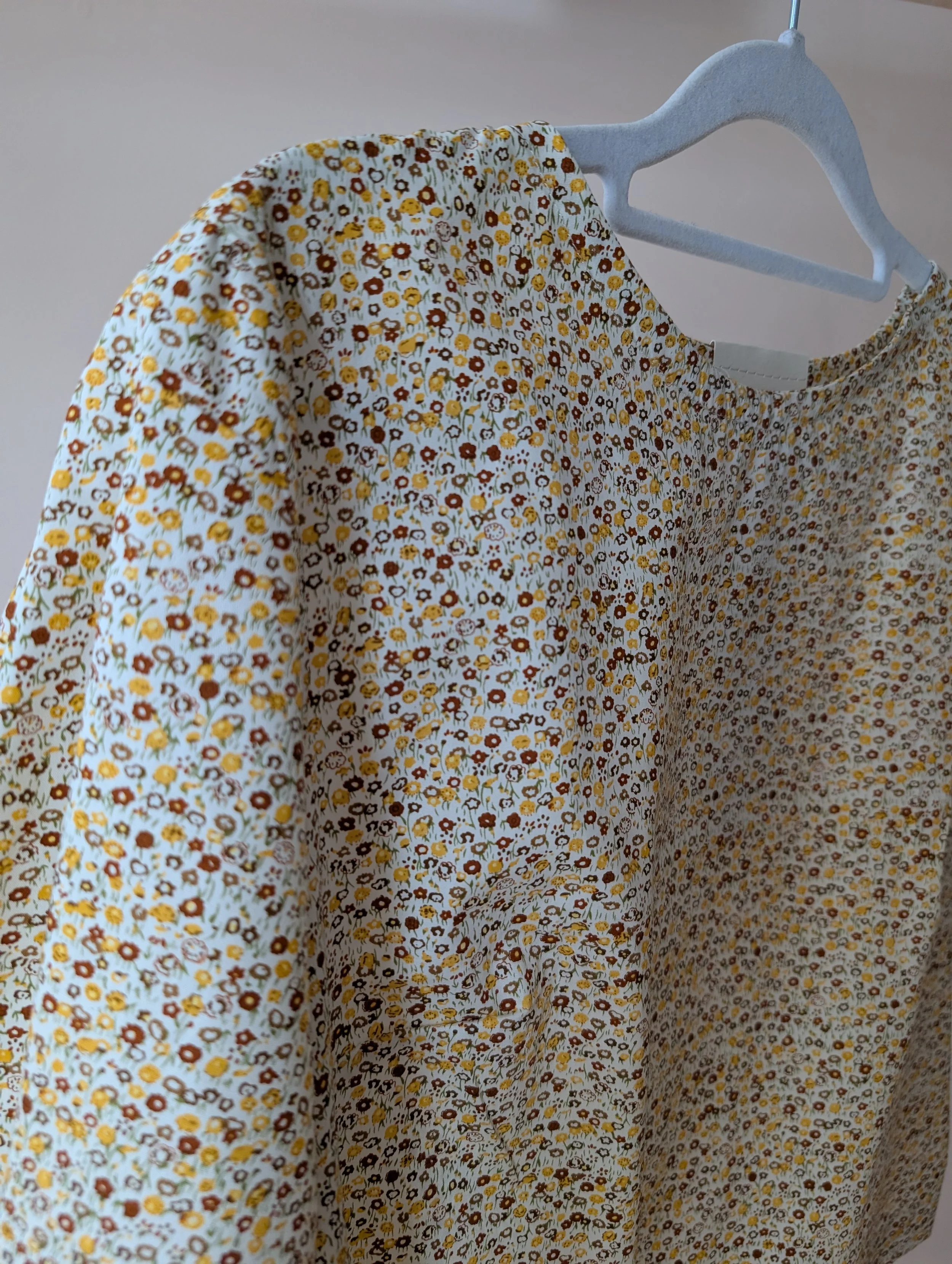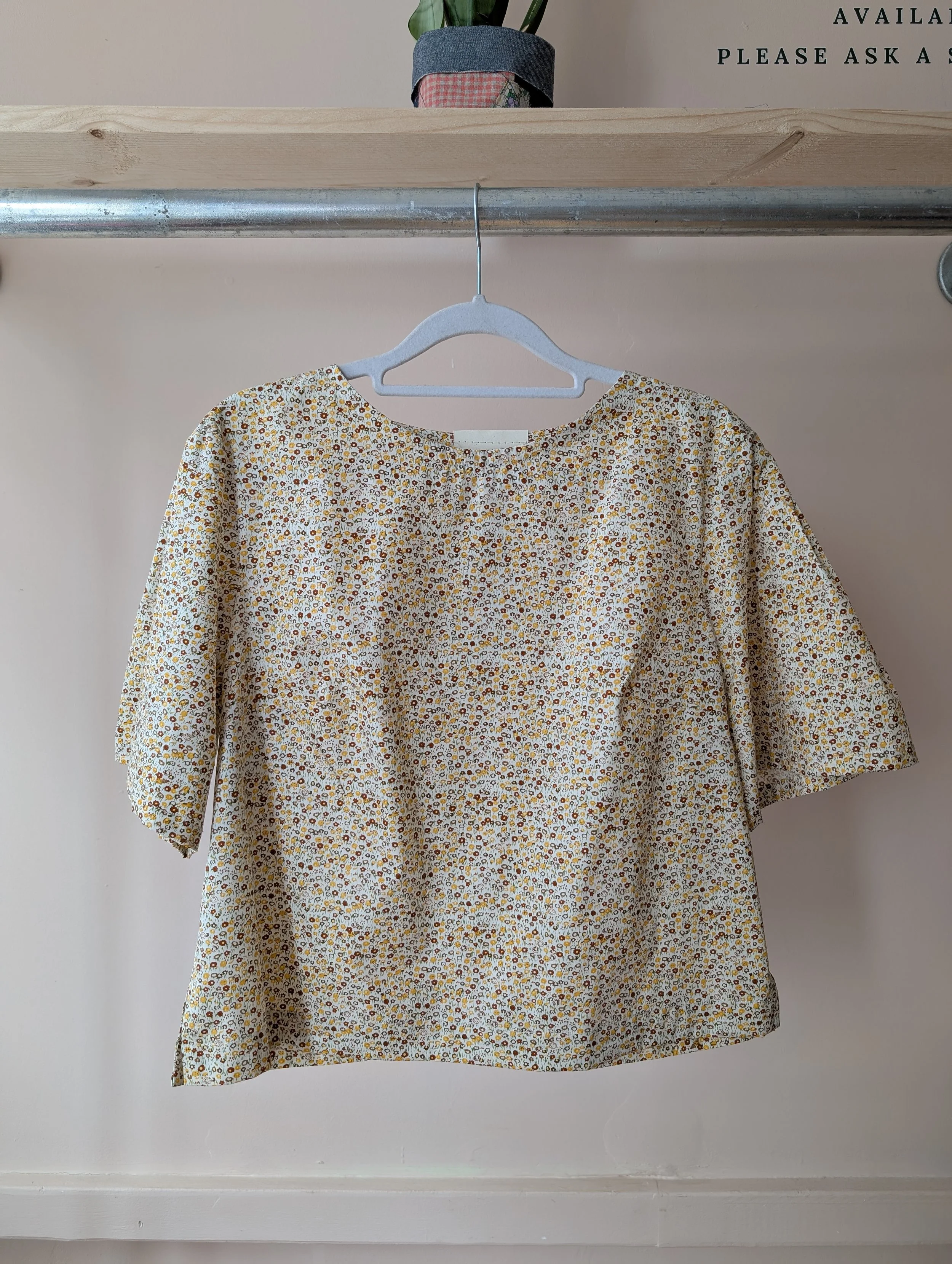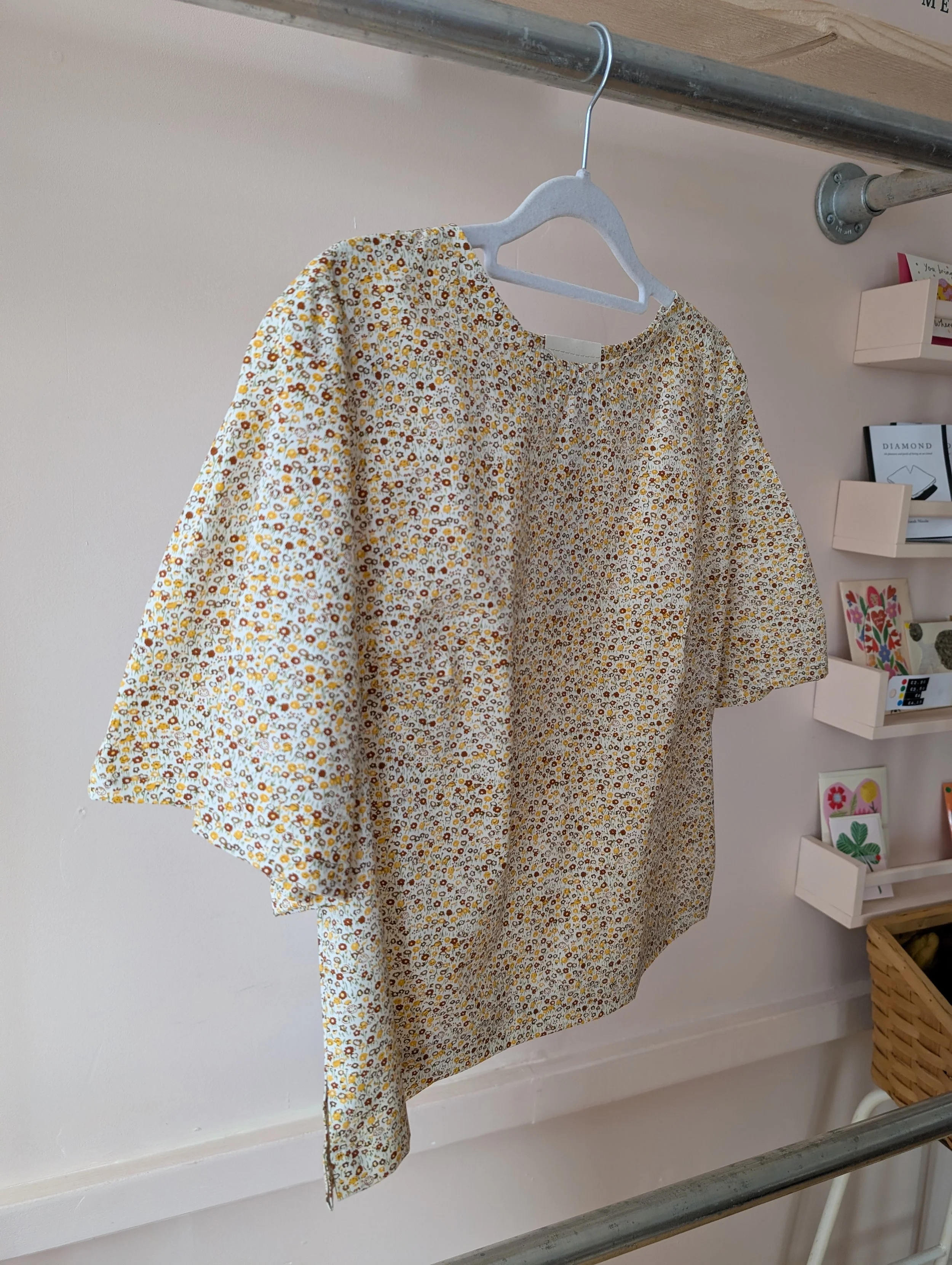 Millie top with pleated short sleeve in yellow and mustard floral cotton. Size Small.